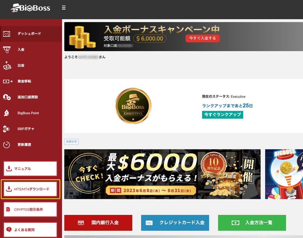 以下のリンクからBIGBOSSを開き右上のマイページでログインします。