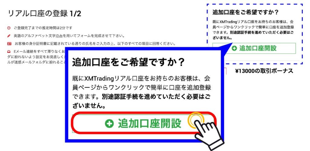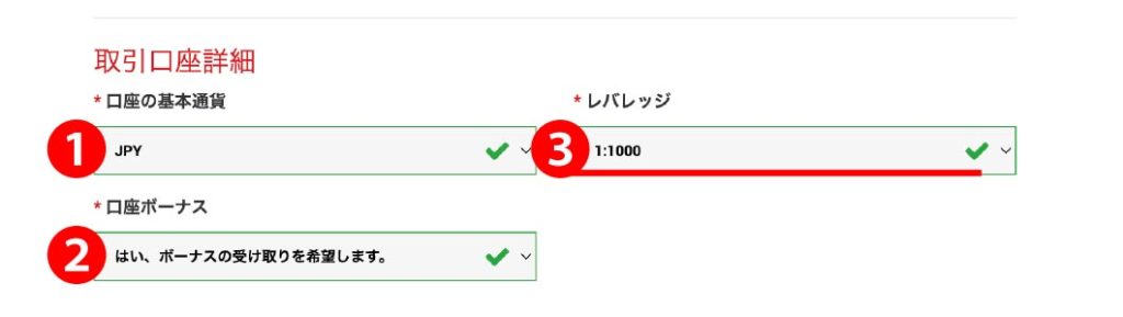 | 3.レバレッジ | 1:1000がお勧め(レバレッジは口座開設後変更できます) |