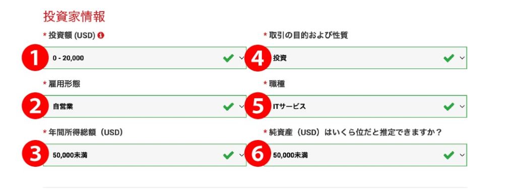 | 1.投資額(USD) | 注意:「0-20000ドル」を選択 |
